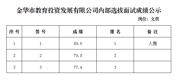 金華市教育投資發展有限公司內部公開選拔工作人員成績公示