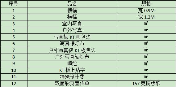 1、橫幅:采用高度為90CM或120CM的牛筋布,絲網印刷制作,要求排版合理大方,印刷清晰,無錯字、別字。按招標方時間要求并在指定地點懸掛好,懸掛平整牢固。